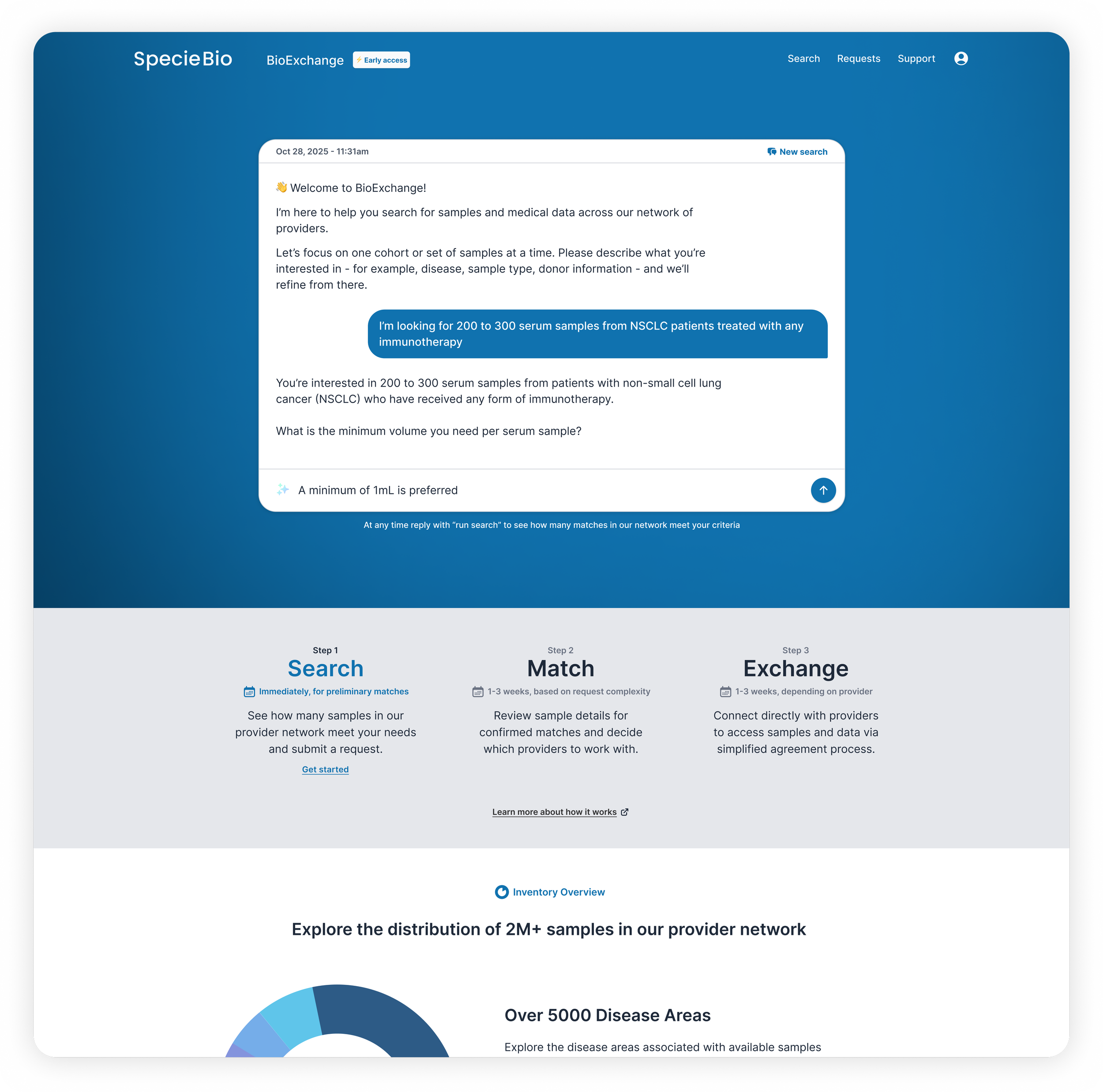 Researchers leverage BioExchange’s AI-driven matching engine to identify how many preliminary matches there are within our network of providers. After the researcher submits a request, Specie Bio will confirm the matches with the relevant providers, and directly connect the researcher with the matched provider to exchange samples and data following a streamlined agreement process.